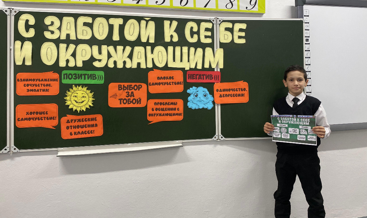25.11.2024Сегодня в нашей школе прошло занятие "Разговоры о важном", где мы обсудили тему "С заботой о себе и окружающих". В наше время, когда темп жизни ускоряется, а стрессы поджидают на каждом шагу, забота о себе становится необходимым условием для внутреннего равновесия. Ведь, осознавая свои границы и учась бережно относиться к своим эмоциям, мы можем лучше понимать чувства окружающих и строить взаимоотношения, основанные на взаимопомощи и уважении. Эмоциональное состояние каждого из нас в значительной степени влияет на наше самочувствие и здоровье. Негативные эмоции, при длительном воздействии, способны ухудшить наше здоровье, поэтому важно учиться регулировать свое эмоциональное состояние. Сегодня на занятии мы играли в игры и смотрели вдохновляющие видеоролики, которые помогли понять, как важно поддерживать друзей, делиться добротой и вниманием.